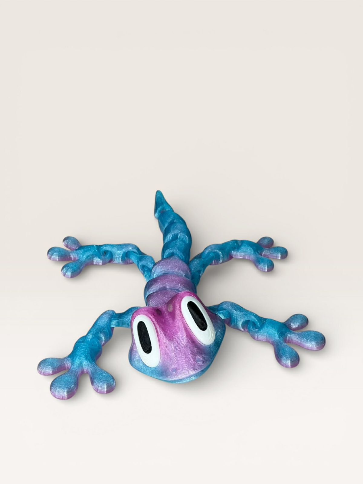 Gecko articulat realizat prin imprimare 3D din PLA biodegradabil, cu magneți în lăbuțe pentru fixare pe suprafețe metalice. Decor sau cadou inedit.